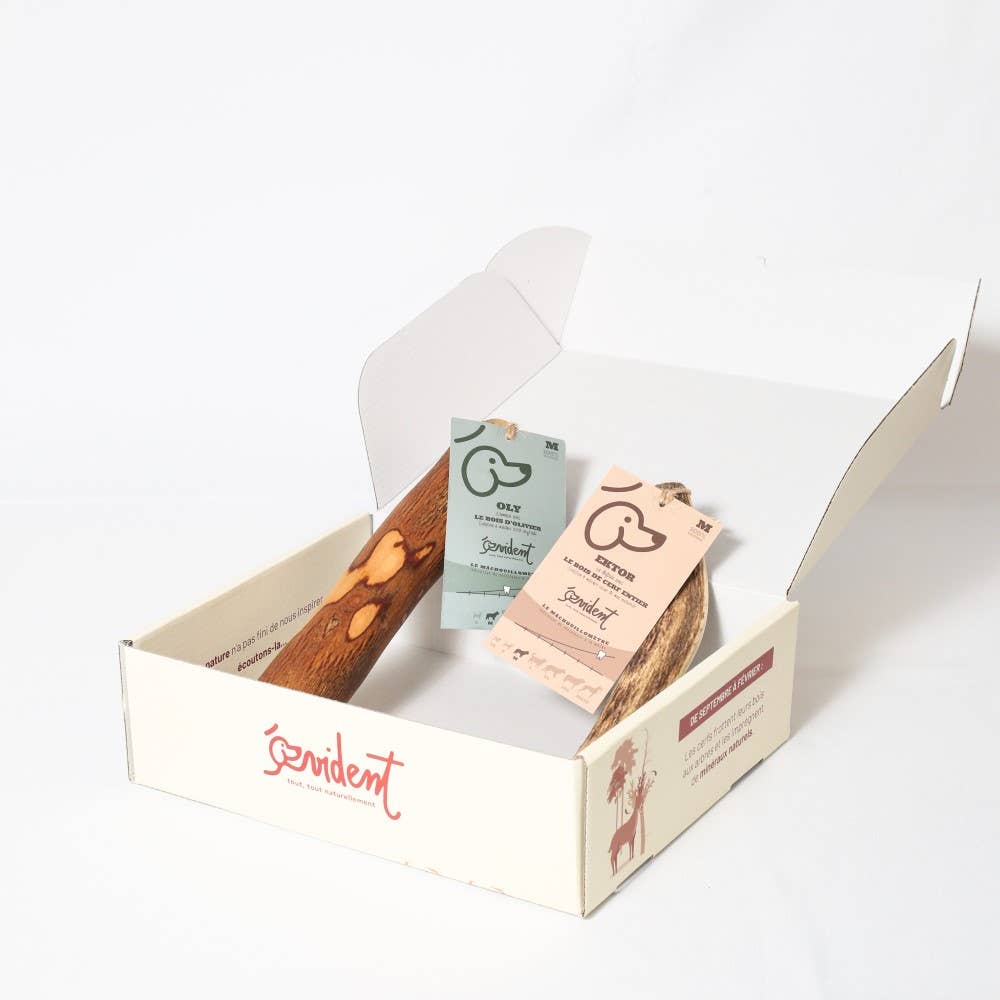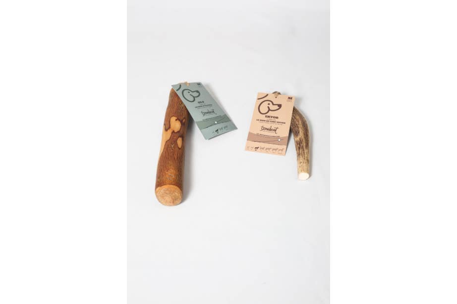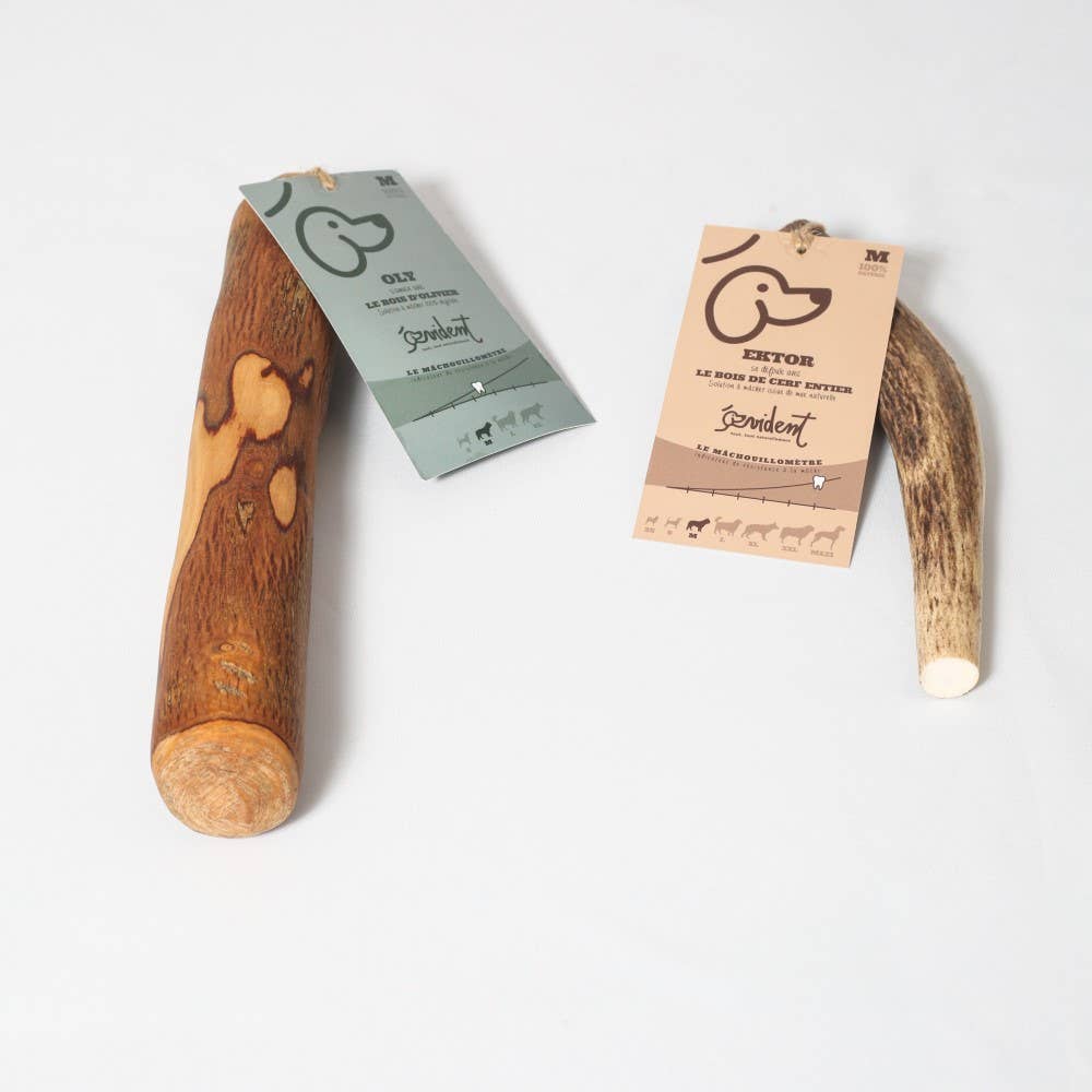 Sélectionnés pour leur résistance et leur durabilité, le bois de cerf entier résistance +++ et le bois d'olivier sauront donner du fil à retordre aux plus tenaces tout en leur apportant le calcium et les minéraux dont ils ont besoin. Le chien devra redoubler d'efforts avant d'accéder à la moëlle dont il raffole. Sélectionné pour son gros calibre, le bois d'olivier est riche en fibres, ne s'écharde pas et permettra au chien de s'occuper pendant des heures !